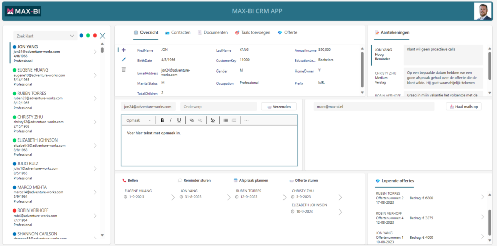 Met een op maat gemaakt CRM-systeem kan je nog meer waarde halen uit alle data, beter inzoomen en acties nog meer finetunen. Het ontsluit meerdere bronnen, zorgt voor een compleet klantbeeld, gegevens zijn overal en altijd beschikbaar en het helpt met het bouwen en onderhouden van je (klant)relaties. Dat geeft jouw klanten direct een meer een persoonlijke beleving. Daarnaast brengt ons CRM-systeem focus voor de verkopers, geeft het inzicht in salesfunnel en is het essentieel voor de marketing van je bedrijf. Ook maakt MAX-BI het mogelijk om PowerBI rapportage te integreren in je CRM-systeem.